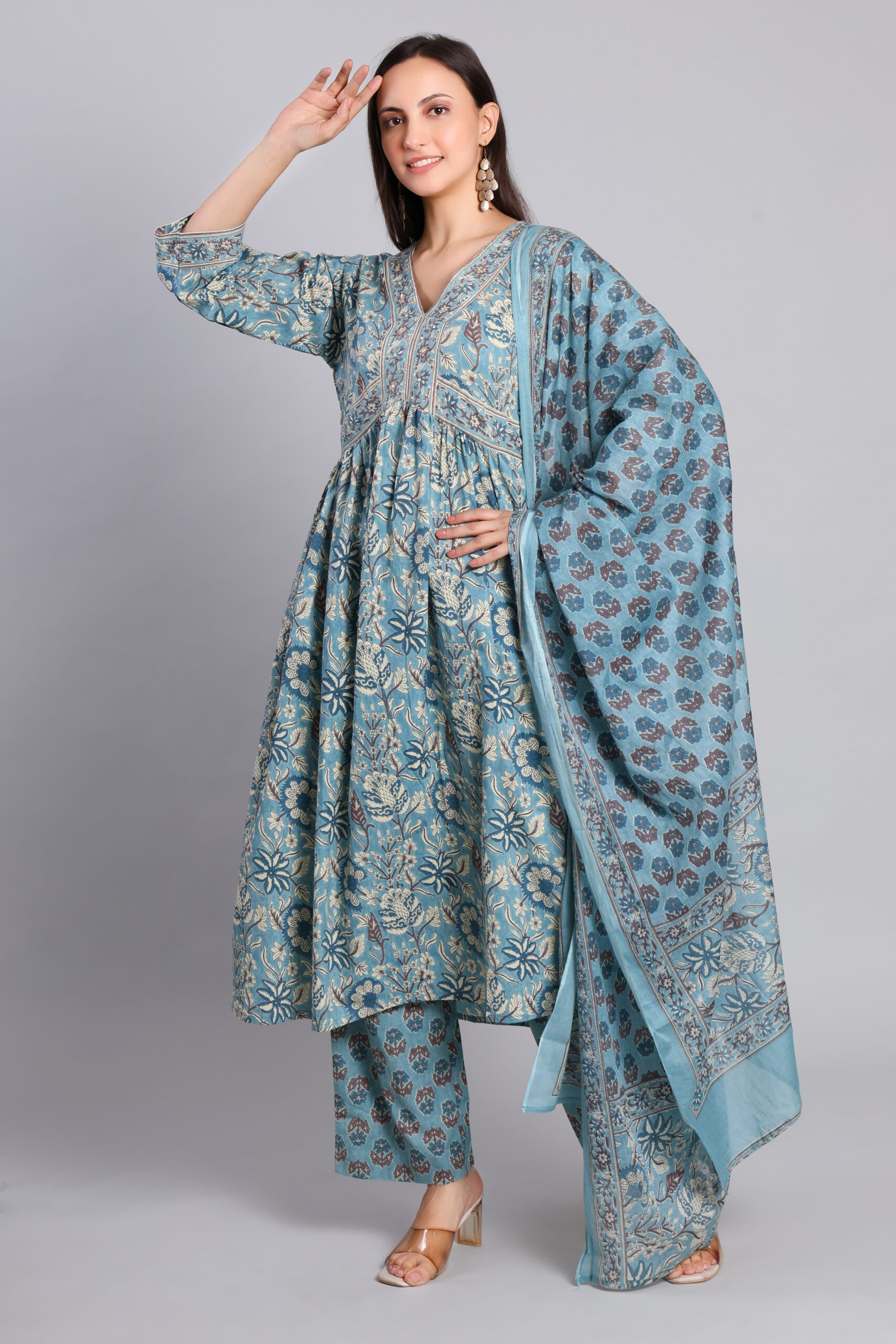 Transform your ethnic wardrobe with the Aqua Bloom Cotton Anarkali Suit Set – it’s the perfect mix of comfort and style, making it just right for festive gatherings and casual get-togethers.