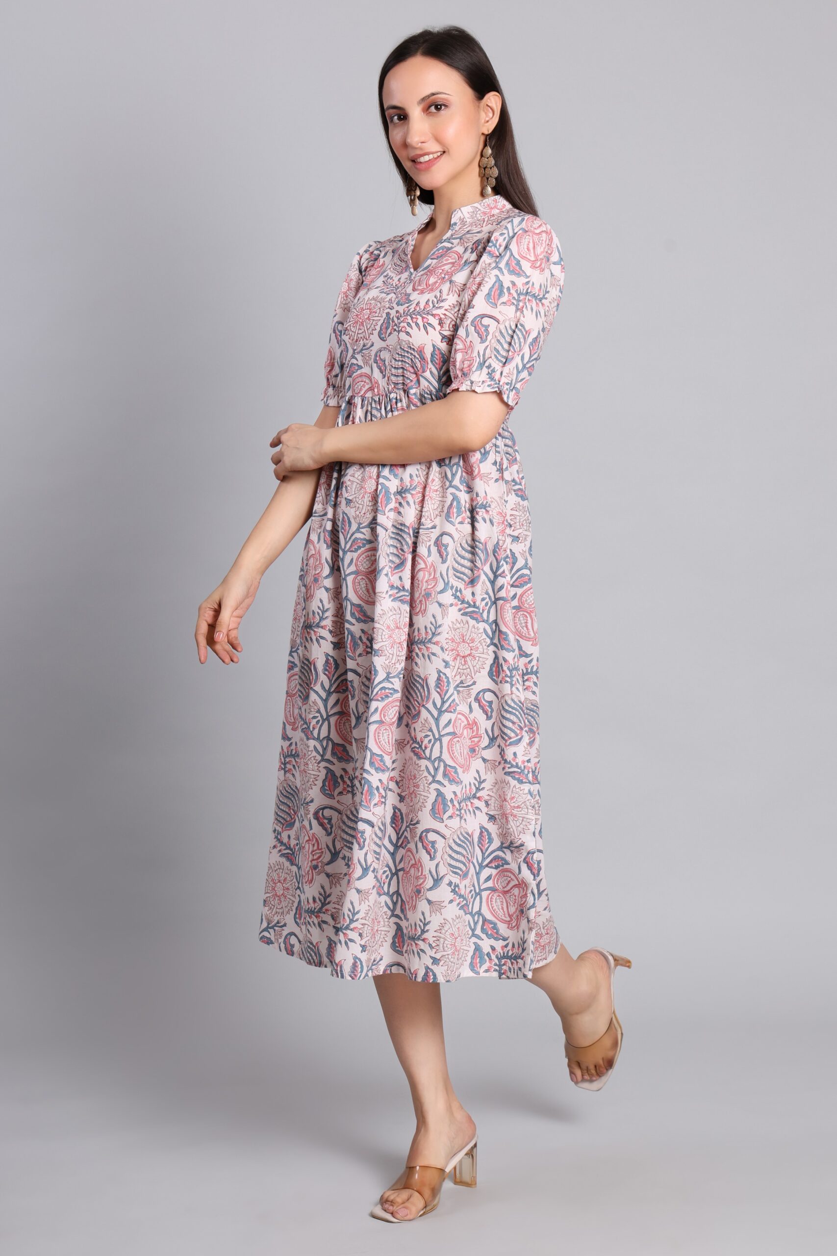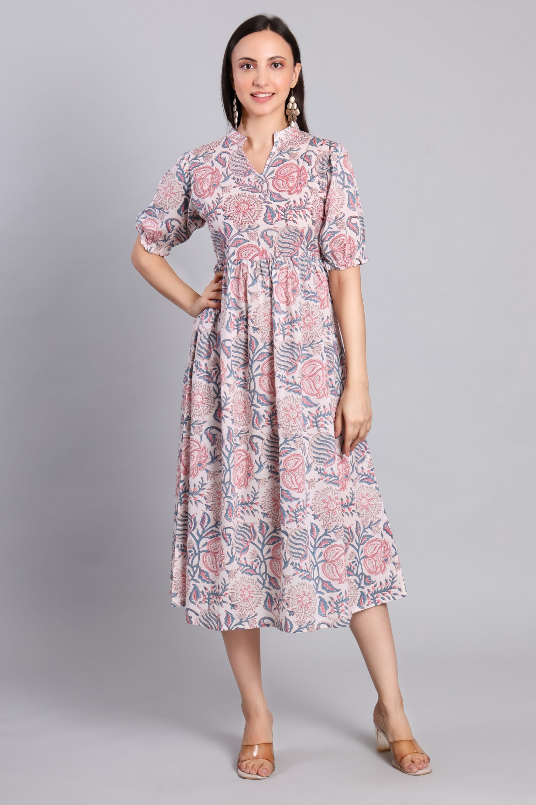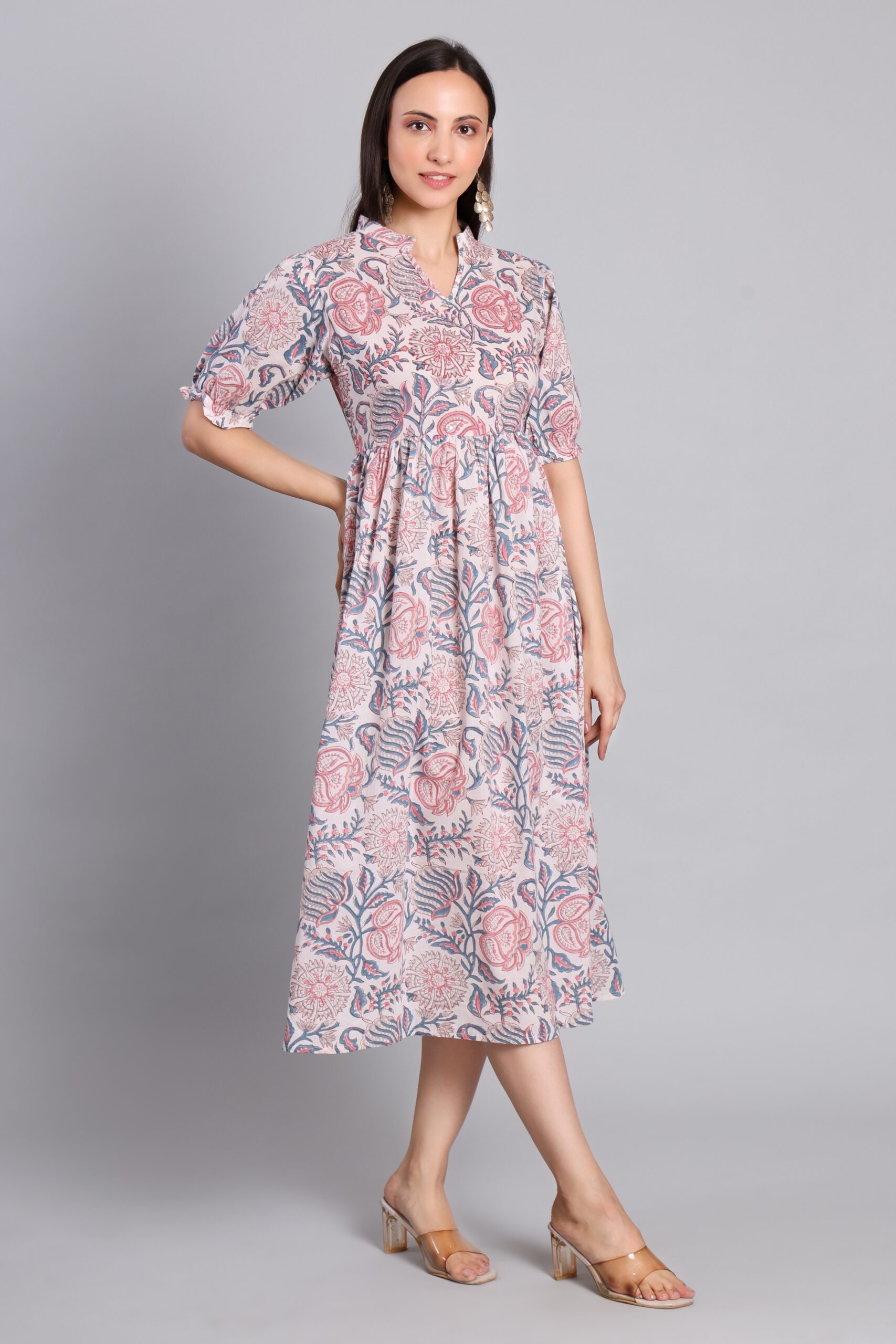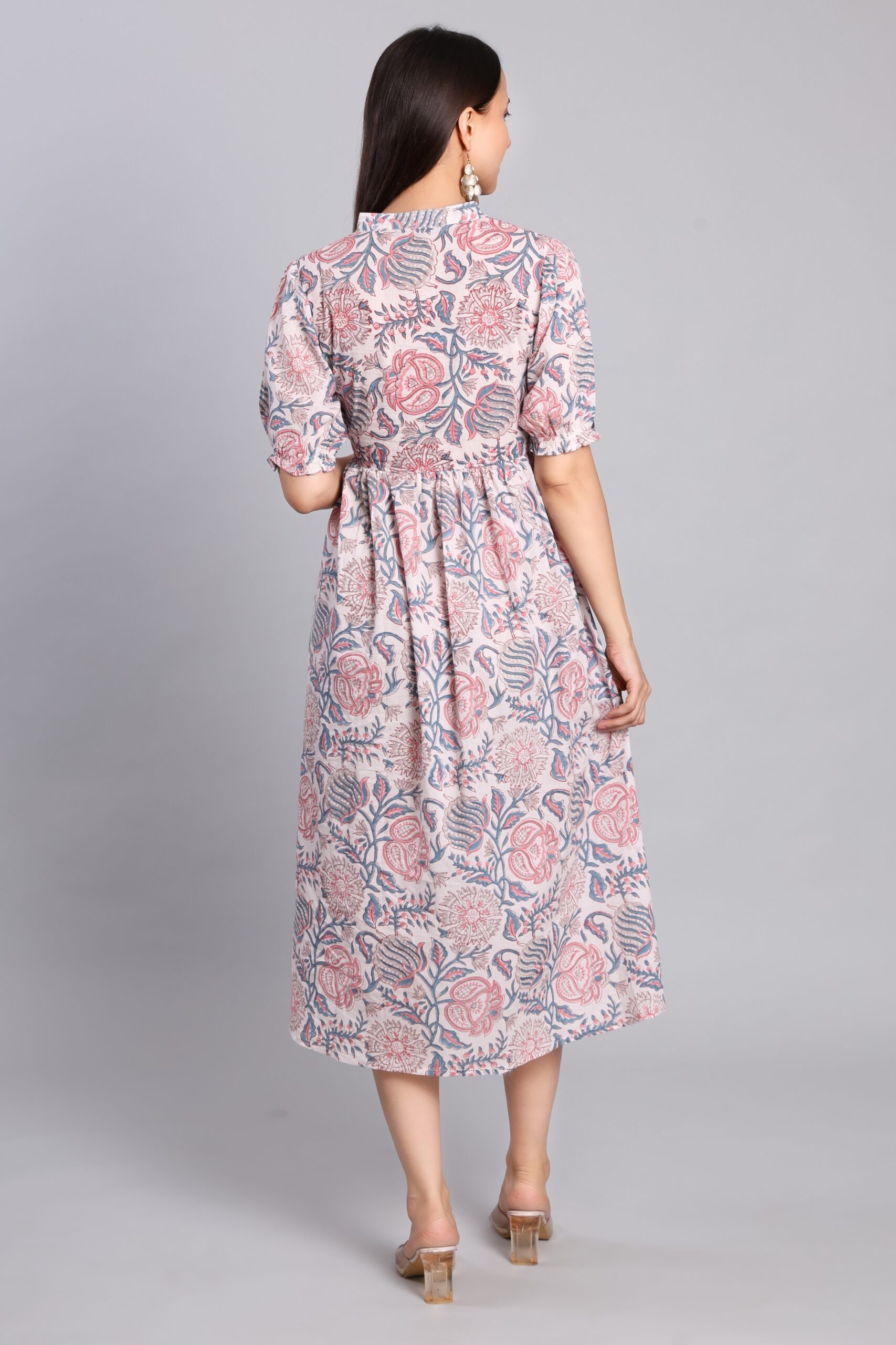 Elevate your everyday style with this beautifully hand block printed cotton midi dress, featuring soft pink floral motifs, a mandarin collar, and a comfortable flared fit — perfect for effortless daytime elegance.