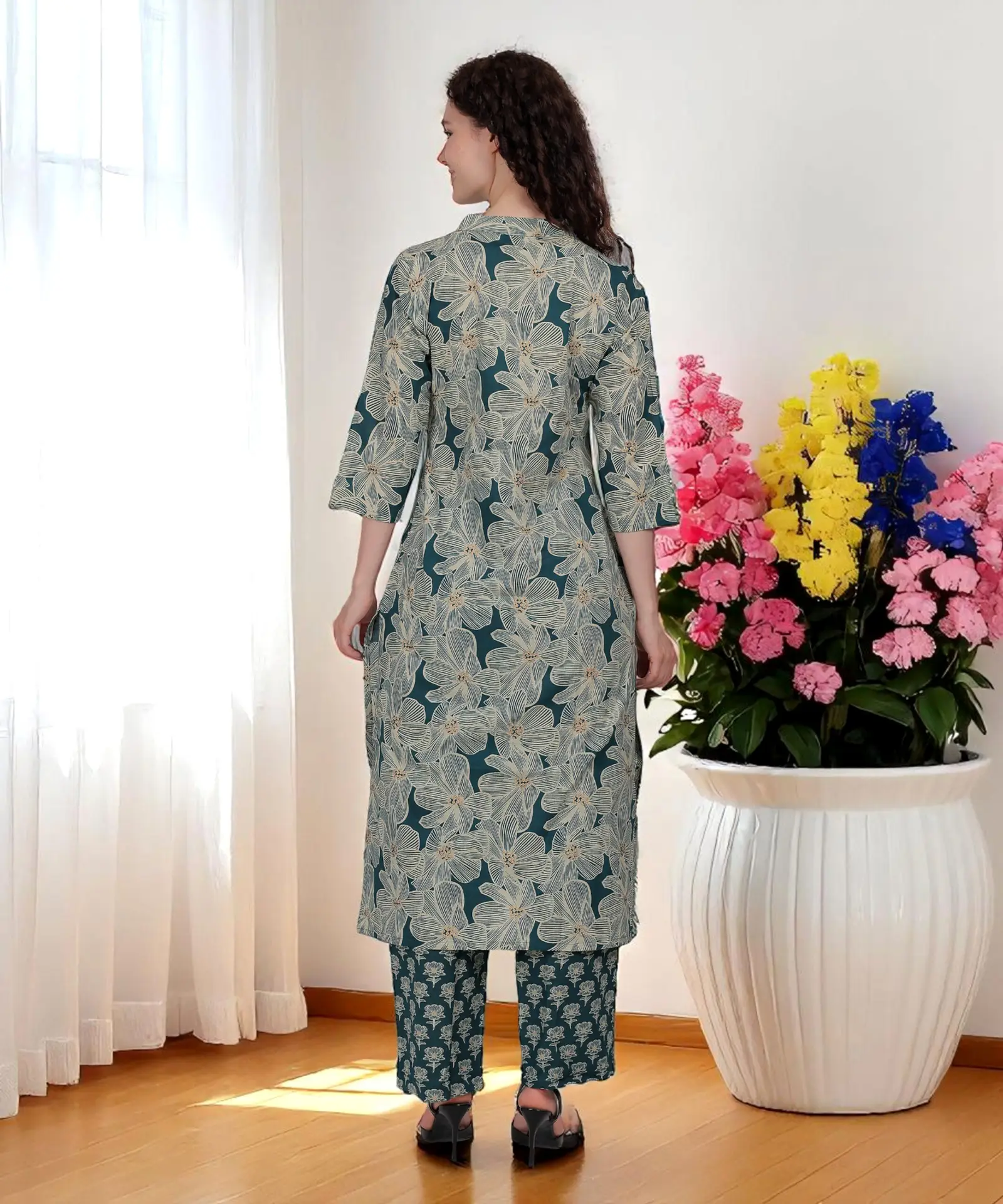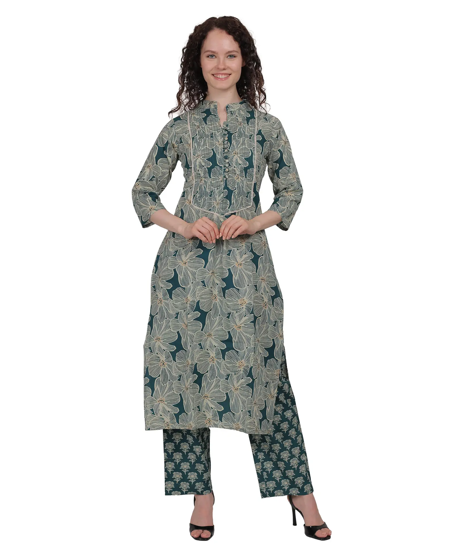 This green printed kurta set features a bold floral design on the kurta, paired with contrasting printed straight pants. The front is detailed with fine pleats and fabric buttons, adding a touch of elegance and structure to the look. Crafted from lightweight and skin-friendly cotton fabric