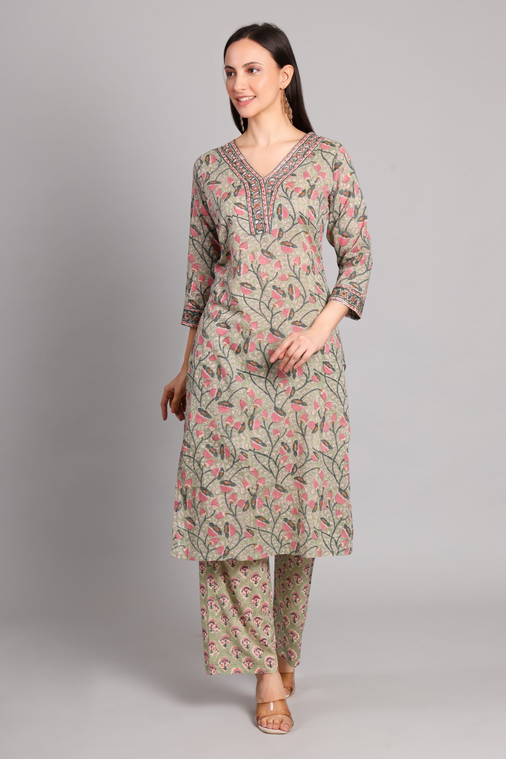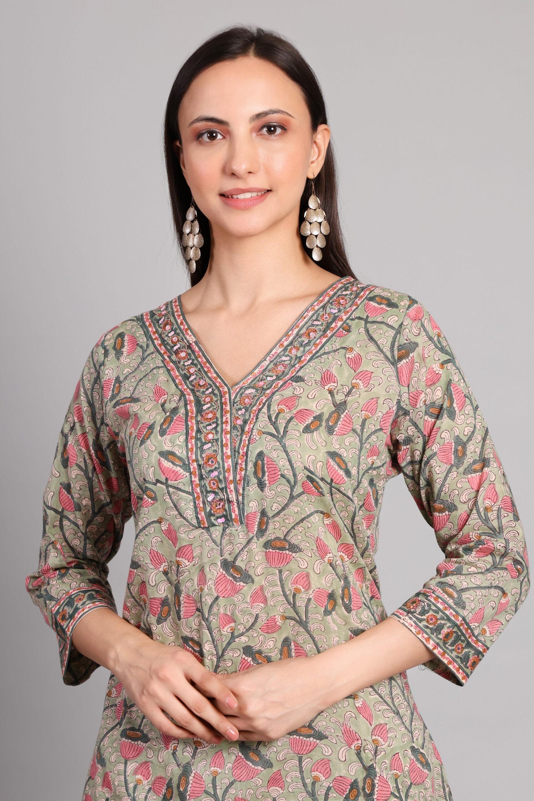 Elegant green cotton kurta set with hand block floral prints, V-neckline, and matching pants ā perfect for work, festive occasions, and everyday comfort.