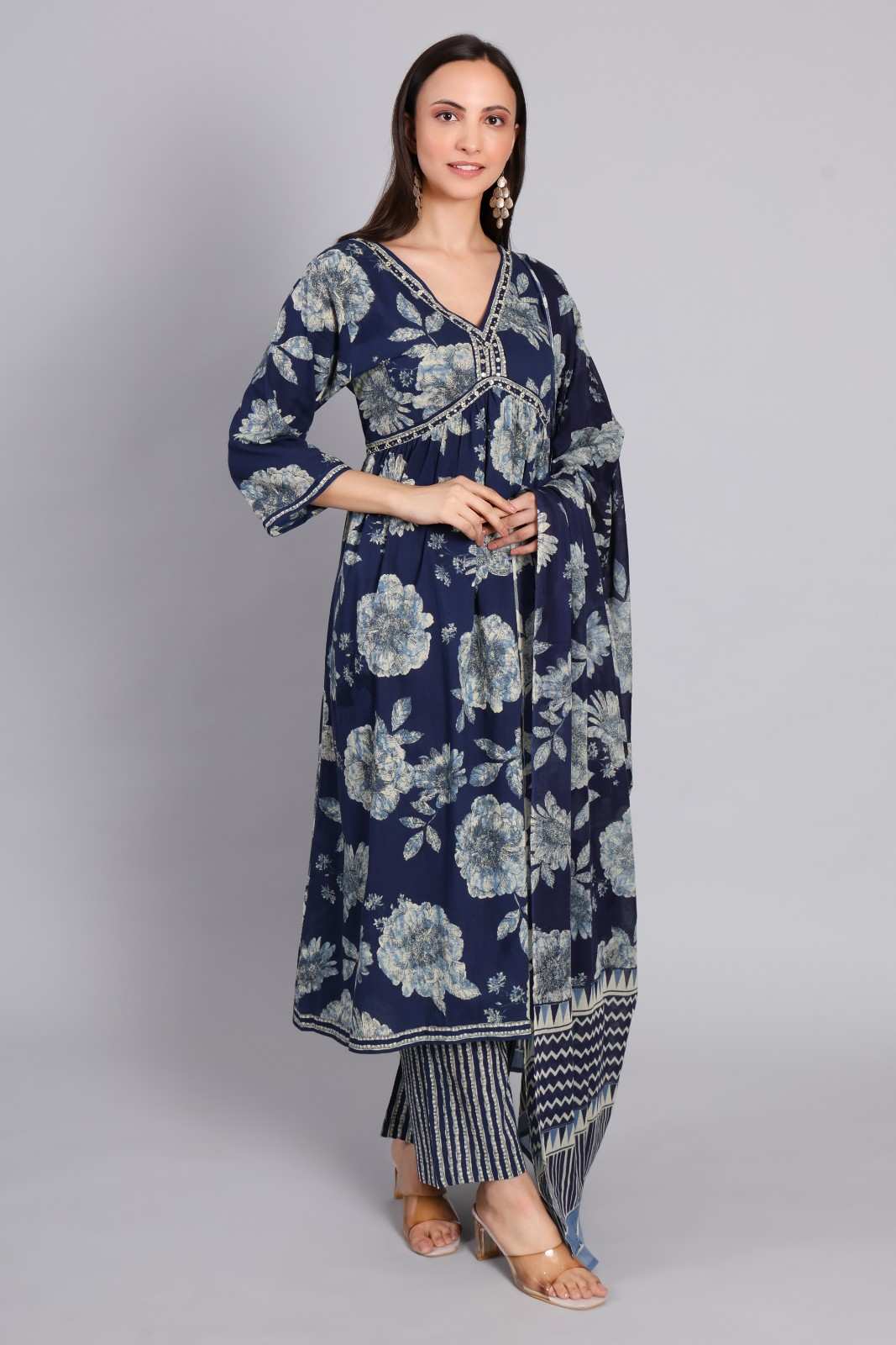 Make a graceful statement with this beautifully designed navy-blue cotton suit set, adorned with large floral motifs and subtle geometric accents. The flared kurta features a flattering V-neckline and elegant gathers, offering a flowy outline that adds charm to your ethnic ensemble. Paired with striped cotton pants and a matching dupatta, this set is crafted from soft, breathable cotton ā perfect for festive gatherings, casual outings, or daily wear with a touch of elegance.
