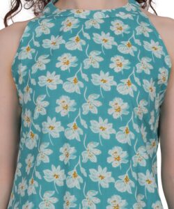 This unique turquoise kurta set, designed with a modern halter neck that gives a fresh twist to traditional wear. The kurta features soft floral prints and is paired with contrasting printed pants for a fun and stylish look. This outfit is great for warm days, casual outings, or when you want something unusual but still comfortable. It is made of light, breathable cotton.